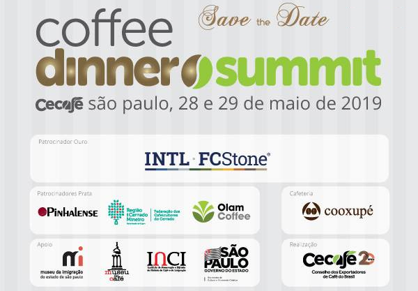 Um dos principais eventos do agronegócio global do café, o Coffee Dinner & Coffee Summit, realizado pelo Conselho dos Exportadores de Café do Brasil (Cecafé), chega a sua oitava edição em 2019, batendo recordes de patrocinadores. Neste ano, o evento conta com apoio de FCStone, Pinhalense e Federação dos Cafeicultores do Cerrado Mineiro, Cooxupé e Olam Coffee.