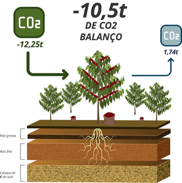 Considerando a transição do manejo tradicional para o mais conservacionista, na média das propriedades avaliadas, constatou-se um balanço negativo de carbono de 10,5 toneladas de CO2eq por hectare ao ano, evidenciando que a cafeicultura brasileira é um importante ativo para a mitigação das mudanças climáticas.