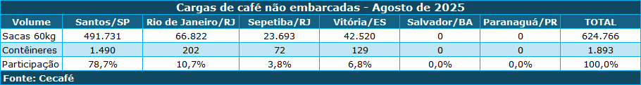 O complexo portuário do Rio de Janeiro (RJ), o segundo maior exportador dos cafés do Brasil, com 15,8% de participação nos embarques entre janeiro e agosto de 2025, teve índice de atrasos de 38% no mês retrasado, com o maior intervalo sendo de 36 dias entre o primeiro e o último deadline. Esse percentual indica que 30 dos 79 navios destinados às remessas do produto sofreram alteração de escalas.