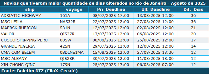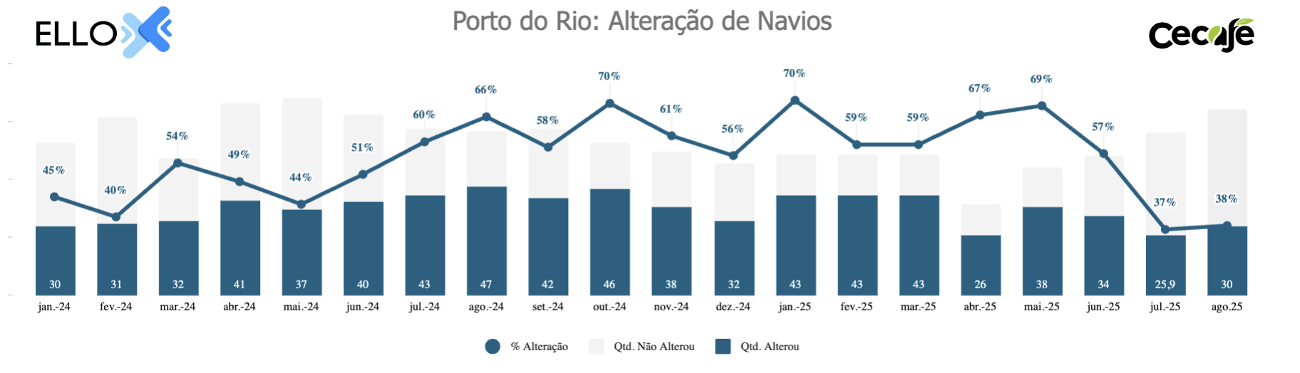 Em agosto de 2025, 50% dos navios, ou 168 de um total de 335 embarcações, tiveram atrasos ou alteração de escalas nos principais portos do Brasil, conforme o Boletim DTZ, elaborado pela startup ElloX Digital em parceria com o Cecafé.