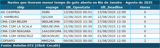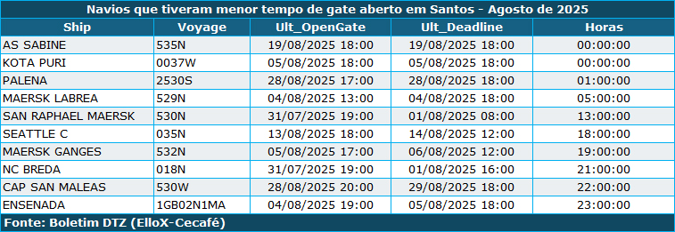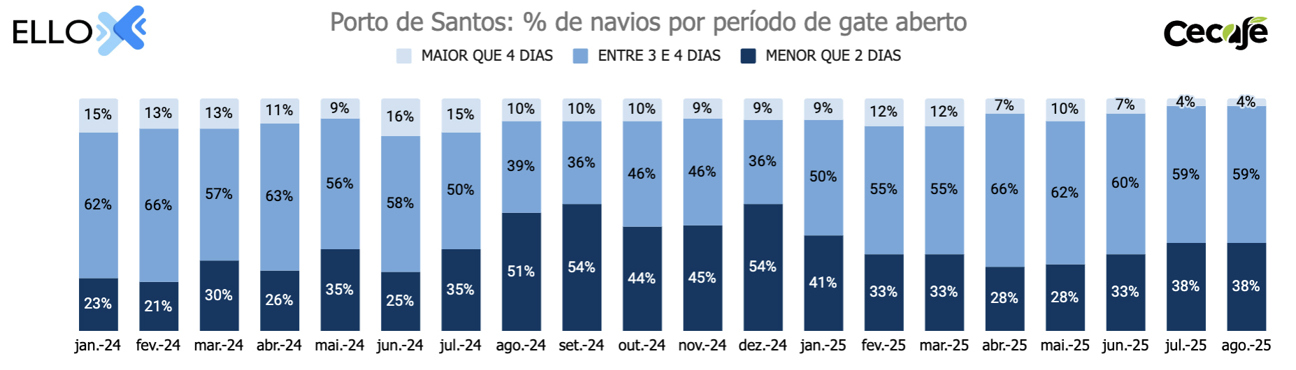 Também em agosto, somente 4% dos procedimentos de embarque tiveram prazo maior do que quatro dias de gate aberto por navios no porto santista. Outros 59% possuíram entre três e quatro dias e 38% tiveram menos de dois dias.