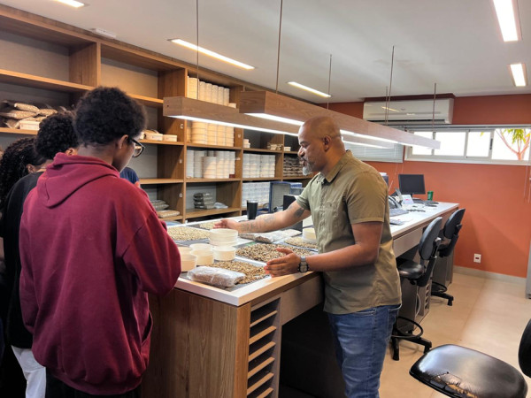 Os estudantes conheceram o setor de classificação, onde as amostras de café são recebidas e avaliadas quanto à qualidade física e sensorial, e aprenderam sobre os principais defeitos e qualidade dos grãos e suas origens produtoras, bem como a importância desses parâmetros para a precificação dos lotes. Em seguida, participaram de uma degustação de cafés com diferentes perfis sensoriais, compreendendo a relação entre qualidade e características da bebida.