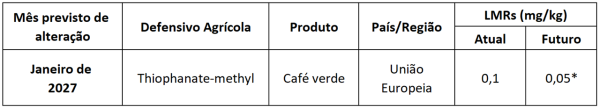 Alertamos que, em sequência à decisão tomada pelo Parlamento europeu, em 18/09/2024, a União Europeia notificou à OMC a queda do LMR do Tiofanato Metílico, em café, conforme quadro abaixo: