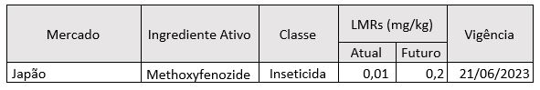 Conforme o regulamento Ac2023, da Japan Food Chemical Research Foundation, passará a vigorar o seguinte Limite Máximo de Resíduo (LMRs) do defensivo agrícola com uso autorizado em café, abaixo listado: