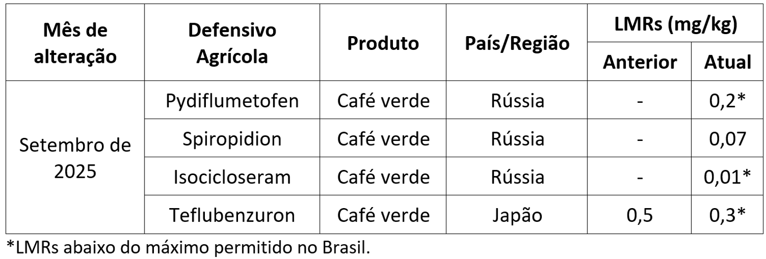 No âmbito do Programa Café Seguro, o Cecafé monitora diariamente, a partir da base de dados da FoodChain ID, alterações nos Limites Máximos de Resíduos (LMRs) de defensivos agrícolas com uso autorizado em café no Brasil, nos principais mercados de destino das exportações brasileiras.