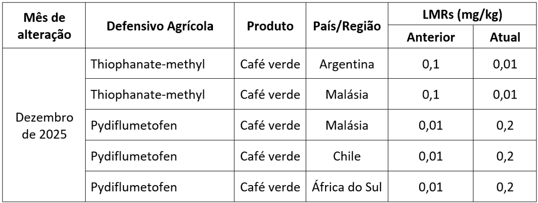 No âmbito do Programa Café Seguro, o Cecafé monitora diariamente, a partir da base de dados da FoodChain ID, alterações nos Limites Máximos de Resíduos (LMRs) de defensivos agrícolas com uso autorizado em café no Brasil, nos principais mercados de destino das exportações brasileiras.