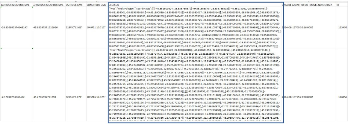 No relatório de propriedades disponível em “Download relatório em planilha”, uma nova coluna de “GeoJson” foi adicionada com a geolocalização das propriedades.