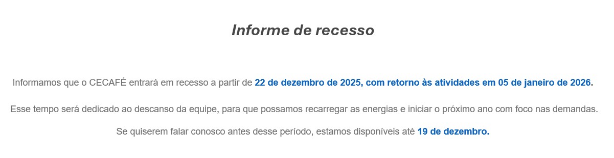 Recesso do CECAFÉ (22/12 a 04/01) Cordialmente, Diretoria Executiva Isabela Costa2025-12-17T15:48:34-03:0017 de dezembro de 2025|Categories: Informes Associados, Sem categoria| Share this content FacebookXLinkedInPinterestE-mail Deixar um comentário Cancelar respostaComentário Lembrar dos meus dados para a próxima vez que eu comentar. Δ