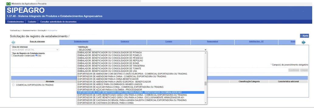 Com o objetivo de facilitar a compreensão da empresa sobre a alteração de seu registro no MAPA, passamos, abaixo, o print extraído do SIPEAGRO, onde consta a opção “EXPORTADOR DE CAFÉ BENEFICIADO GRÃO CRU PARA A CHINA – BENEFICIADOR OU EMBALADOR” que deverá ser selecionada pelo exportador.