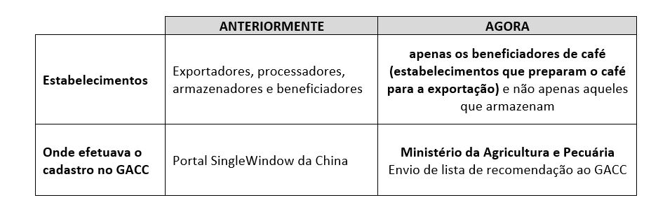Também destacou que as empresas que não possuírem tal habilitação poderão exportar seus produtos para a China, desde que o café se origine dos estabelecimentos beneficiadores cadastrados no CGC/MAPA, com o devido perfil requerido, já recomendadas e enviadas ao GACC, utilizando número de registro da empresa no SIPEAGRO.