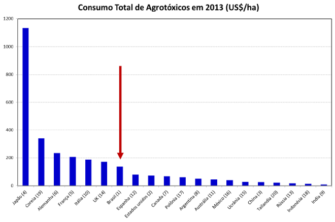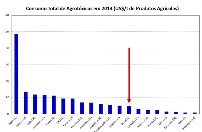 Apesar de utilizar o maior volume de defensivos, o que se justifica pelo tamanho das áreas produtivas, de porte continental, o Brasil está em 7º lugar na proporção do uso por hectare de área cultivado, ficando atrás de países como Japão, Alemanha, França e Reino Unido.