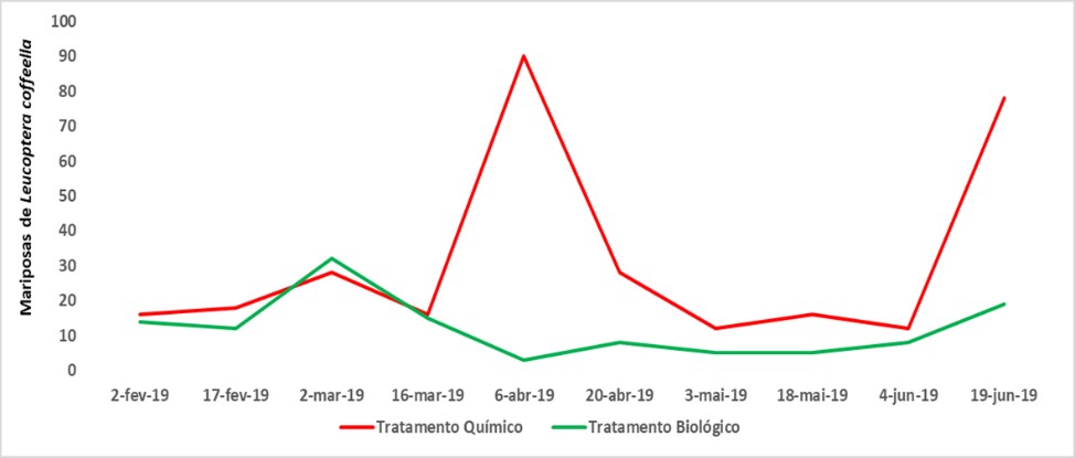 Figura 1– Comparativo do número médio de adultos do Bicho-mineiro (Leucoptera coffeella) em área tratada com liberações da larva de Chrysoperla externa e de área de cultivo convencional tratada com aplicações de inseticidas químicos.