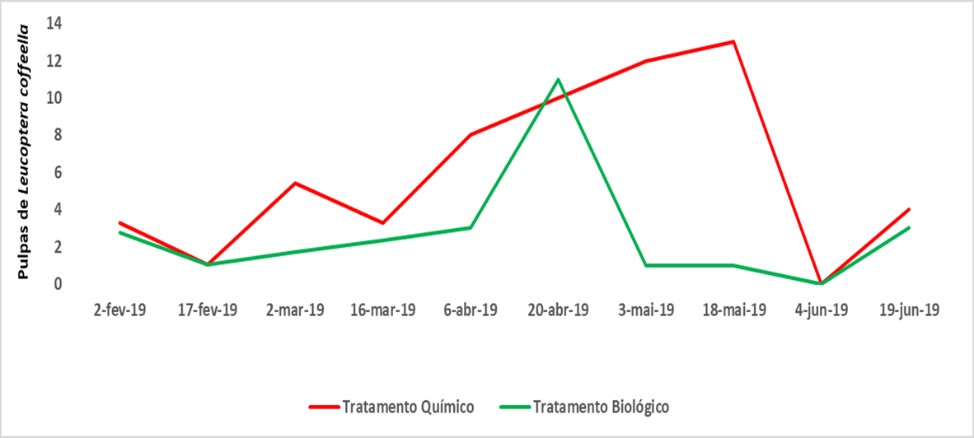 Figura 2– Comparativo do número médio de pupas de Bicho-mineiro (Leucoptera coffeella) em área tratada com liberações da larva do crisopídeo Chrysoperla externa e de área de cultivo convencional tratada com aplicações de inseticidas químicos.