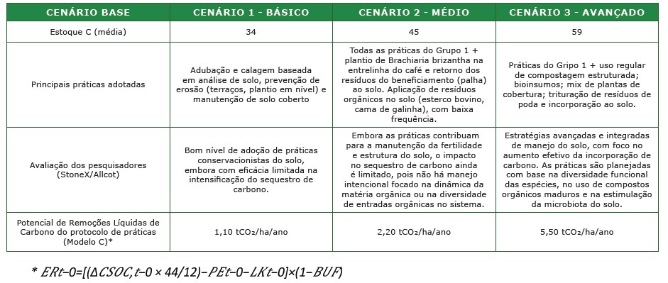 Com isso, a modelagem permitiu identifi car três cenários, de acordo com as principais práticas adotadas em cada grupo de fazendas e respectivo potencial de remoções líquidas de carbono.
