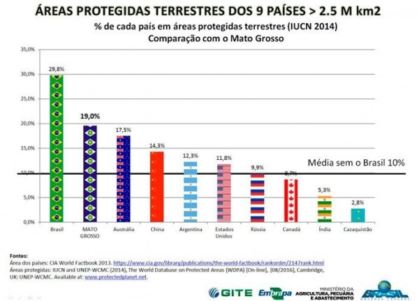 Somente o Mato Grosso possui 19% de áreas protegidas, representação maior que toda a Austrália inteira. Além disso, 29,4% do estado é preservado por conta de reservas legais e áreas de preservação permanente (APP’s) nos imóveis rurais. Se considerada também a vegetação excedente e áreas lacustres e palustres preservadas, o índice sobe para 36%. A soma de todas as áreas preservadas e protegidas representa 55,2% do estado e 63,3% das áreas rurais e atribuídas.